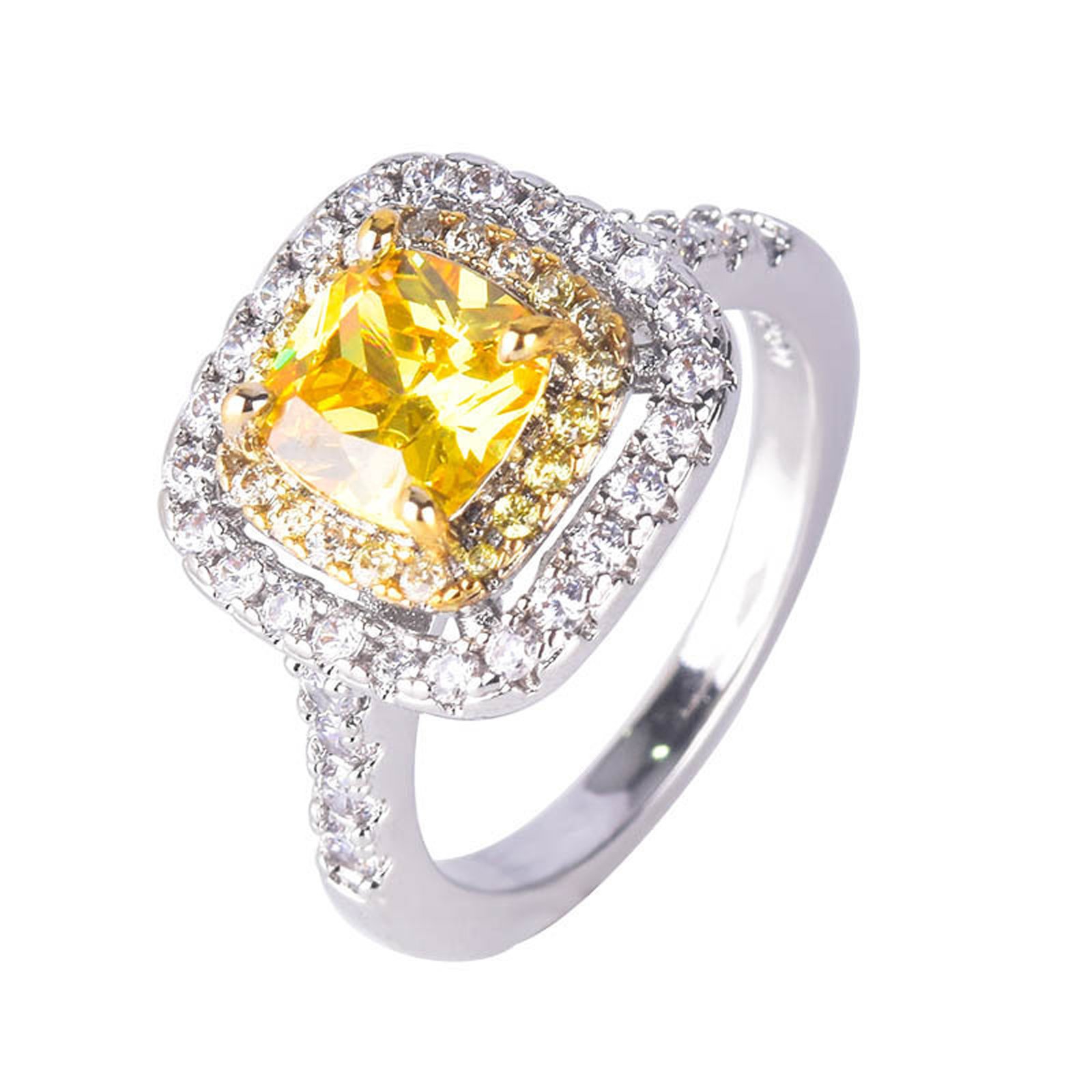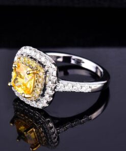925 Sterling Silver Plated Cushion Shape Simulated Citrine CZ Halo Engagement Ring Promise Rings for Women